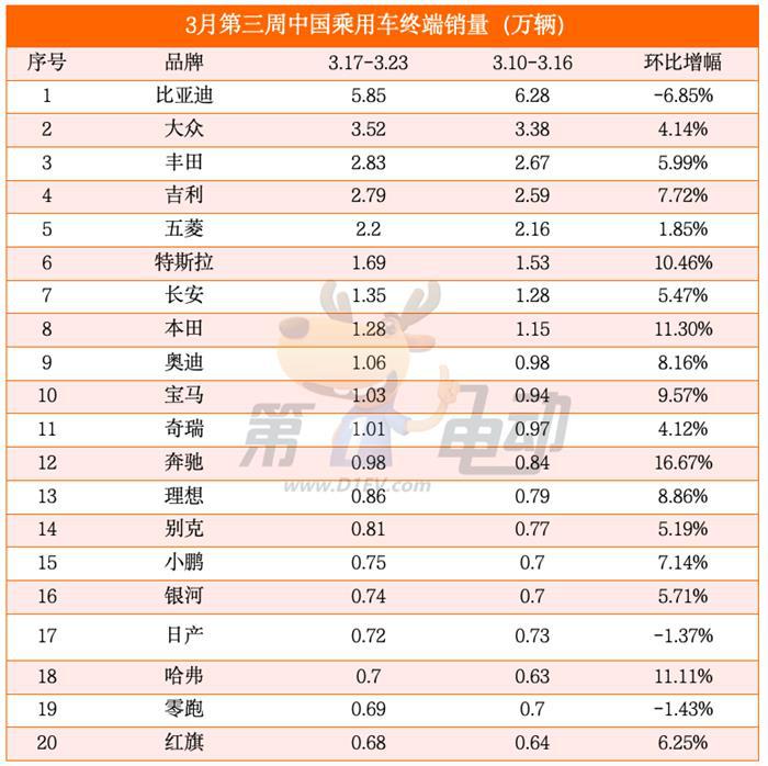 根据易车公布的3月第三周(3.17-3.23)乘用车终端销量数据,比亚迪周销量环比回落7%,旗下八大主力车型集体出现不同程度的销量下滑,成为拖累整体表现的重要因素。
