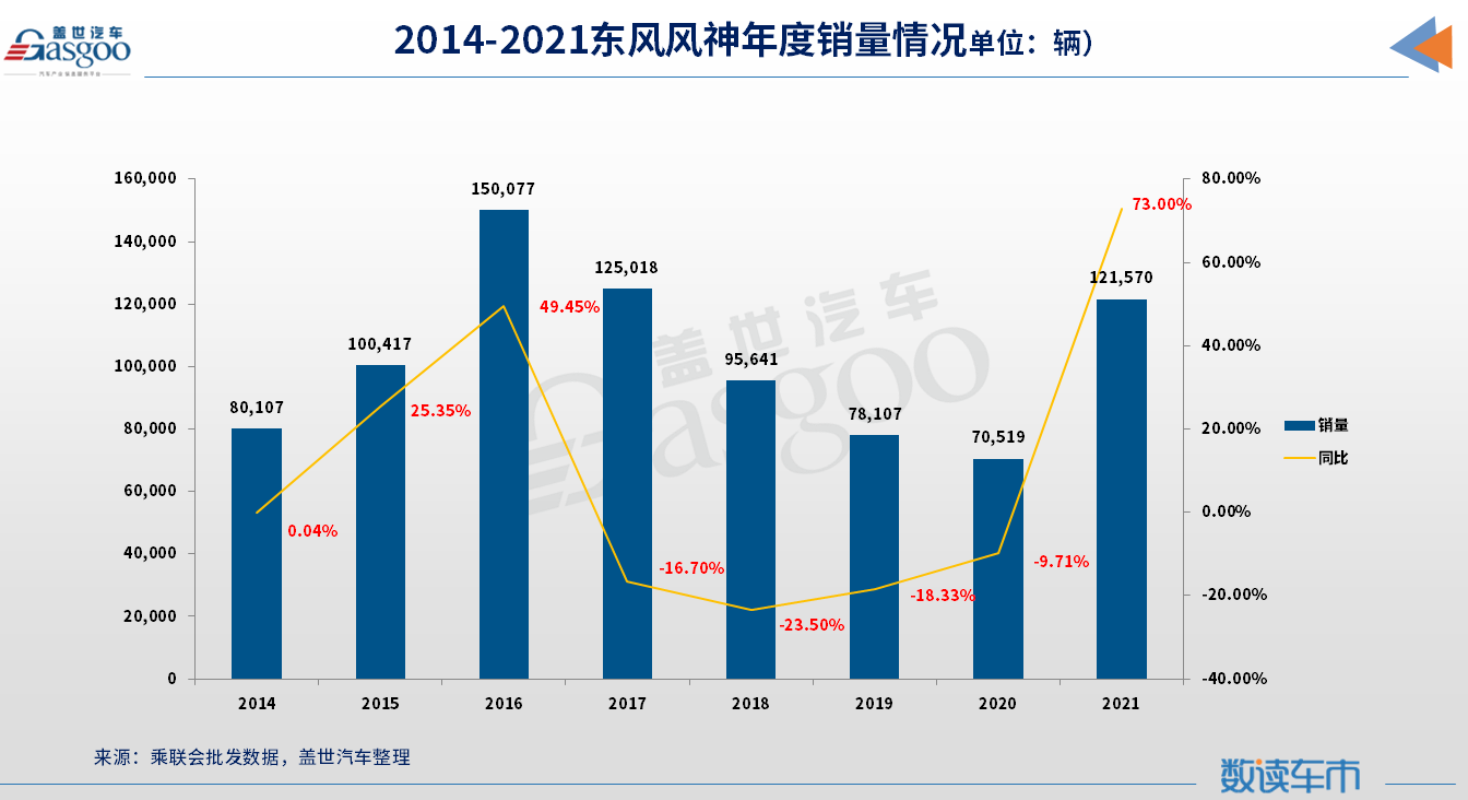 东风风神,作为东风乘用车公司的主力品牌,一直是东风汽车在乘用车领域重点扶持的对象。自品牌诞生以来,东风风神在东风大自主体系内一直享有资源“最优”待遇。梳理东风风神近8年的发展轨迹我们发现,2015年是其发展历程中的转折点,这一年,借着SUV高速增长的“东风”,东风风神年销量首次突破10万辆大关;2016年,东风风神再迎巅峰,年销量以接近50%的同比增速挺进15万台的门槛。2017年,东风风神开始走起了下坡路,年度销量下滑至12.5万辆;2018年至2020年,其年销量均低于10万辆,直到2021年,销量再度回升至2017年的水平。