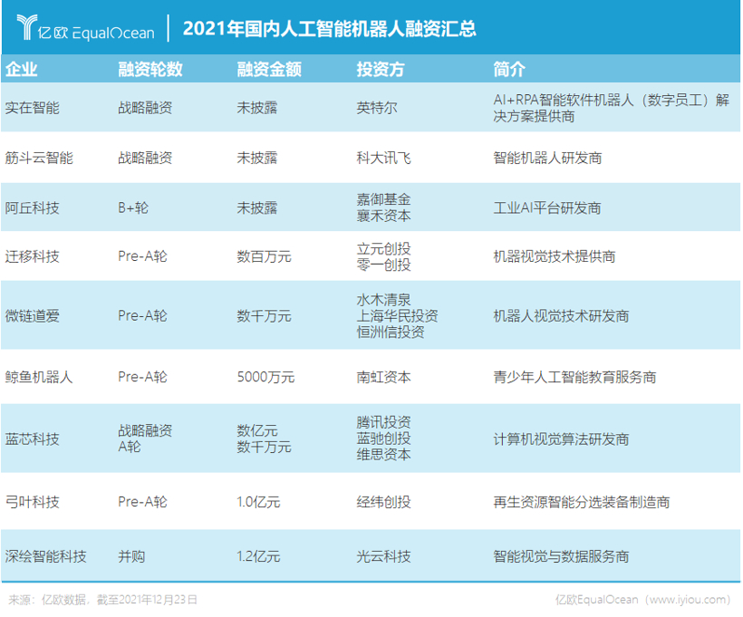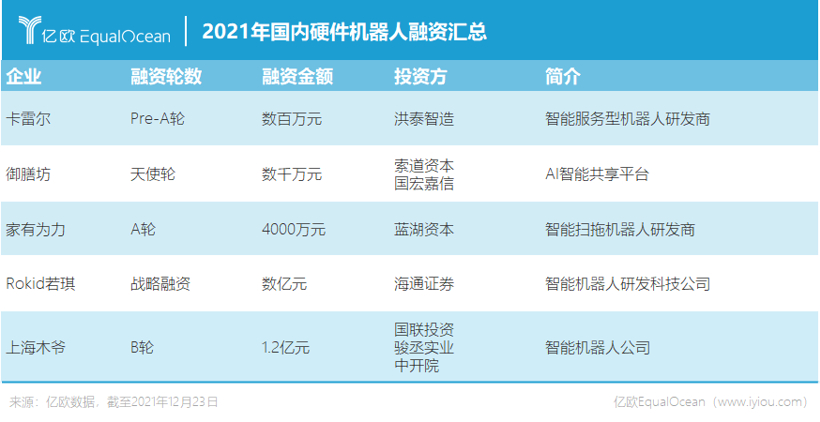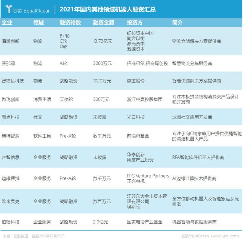亿欧数据显示,截至12月23日,中国机器人领域新增融资事件共计165起,较2020年减少31.8%。但同期融资总额达196.1亿元,同比仅减少26.7%。这意味着,平均每家企业获得的融资金额在2021年上涨1.19亿元。