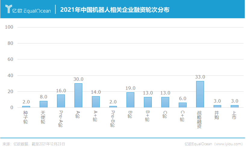 从融资轮次来看,2021年中国机器人相关企业融资仍以中早期轮次为主。融资轮次在战略融资阶段最多,共计33起,占比20.2%;A轮融资事件为30起,占比18.4%;B轮融资事件为19起,占比11.7%;Pre-A轮融资事件为16起,占比9.8%;A+轮融资事件为14起,占比8.6%;C轮和B+轮融资事件均为13起,各占8%。