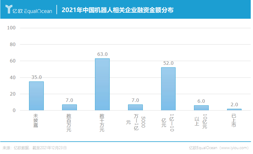 总体上,据亿欧数据统计,2021年融资额超过亿元的机器人相关企业数量为58家,同比2020年融资额超亿元的机器人相关企业67家下降13.4%;2021年融资超10亿元的机器人相关企业数量为6家,分别为思灵机器人、高仙机器人、梅卡曼德、达闼科技、海柔创新和博实股份。