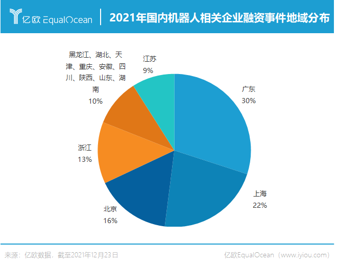 从地域分布来看,2021年中国获得融资的机器人企业依然主要分布在沿海发达地区。其中,广东49家,上海36家,北京26家,浙江21家,江苏14家,注册地在上述五大省份的企业共计占比约89.6%。除上述5省市外,全国仅9个省市有机器人相关企业获得融资,企业总数也只有17家,共计占比10.4%。