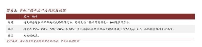 另外,中金公司指出,RCEP将利好中国二轮车出口。印度、中国、印尼、越南和泰国是全球摩托车销售大国,在RCEP协定中,印尼、越南均对中国摩托车有较大幅度的税收优惠。其中印尼对于中国绝大部分摩托车、电动二轮车产品实行税收优惠、最终税收均降为0。