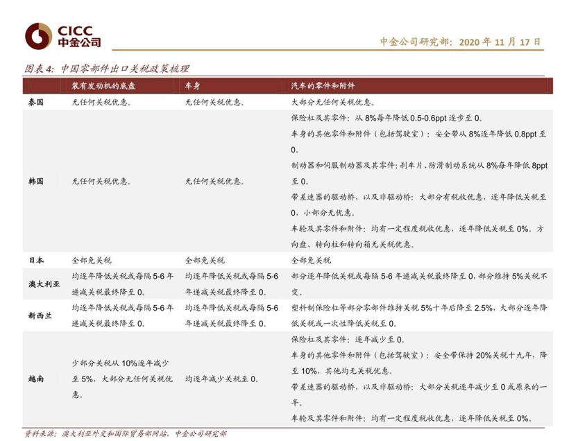 具体来看,按照RCEP协定,日本对于各零部件持完全开放态度,东盟提供小幅降低关税,中国韩国对部分零部件基于关税优惠,但对小部分零部件仍保持高税率。