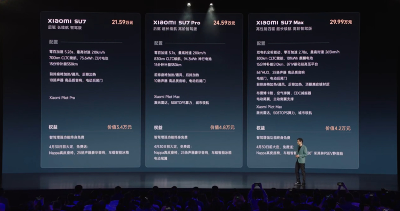 不仅如此,在4月30日前下定标准版的用户,还会赠送冰箱、豪华音响、真皮座椅以及小米智驾Pro,相当于在21.59万元指导价的基础上再次降低3.4万元,实际起售价只有18.19万元。