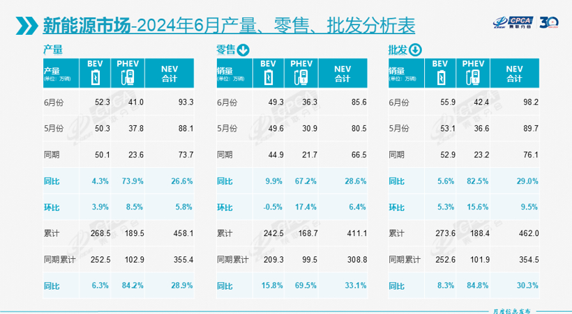 6月新能源市场则依旧保持着强劲的走势,其零售和批发销量分别同比增长28.6%和29.0%。