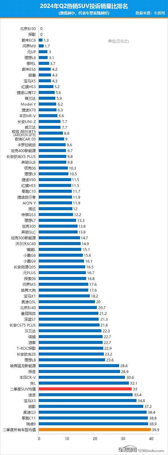 据国内领先的缺陷汽车产品信息收集平台车质网数据显示,2024年二季度共受理国内SUV投诉量累计为13,694宗,乘联会数据显示同期国内SUV(除进口车)销量约为243.3万辆,涵盖330款车型。为确保数据的准确性,车质网本次只统计这330款车型的首次投诉案例,计算得出2024年二季度SUV投诉销量比均值为万分之33,较一季度万分之57.4的均值有明显降低,整体投诉销量比表现呈现出转好迹象。
