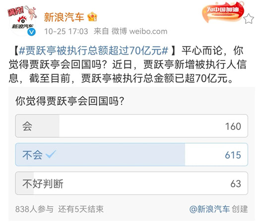 “贾跃亭被执行总额超70亿元”的消息一经爆出,新浪汽车便在微博中发起“是否回国”相关话题的投票,有限的样本容量中,大多人均笃定地认为前者“不会”。显然,民心已然能够证明所向。