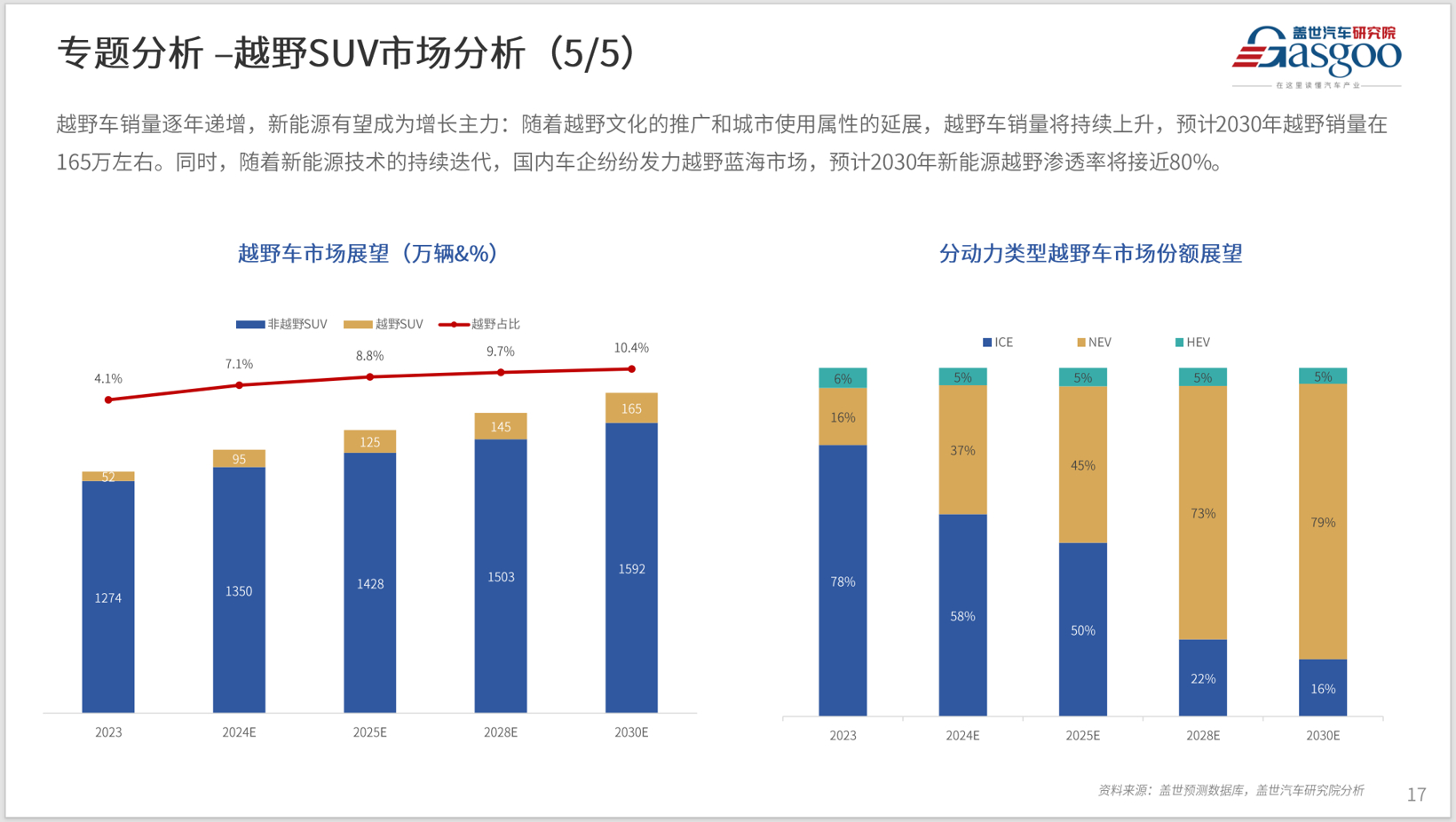 一边是像坦克500这样的硬核产品层出不穷,另一边越野文化也得到了大发展,国内越野市场正在快速壮大。据乐车生活集研究院预测数据显示,到2030年越野车的市场规模将达到165万辆左右,约占据整个SUV市场10%的份额,这比2023年52万辆的市场规模翻了3倍之多。